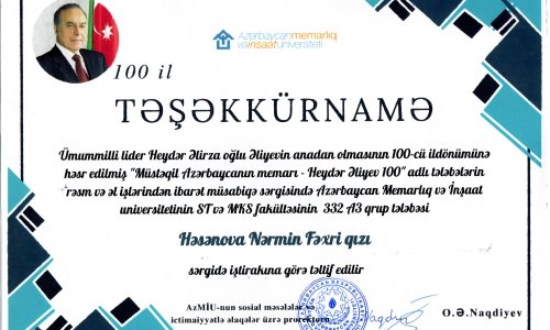 AzMİU-da Ümummilli Lider Heydər Əlirza oğlu Əliyevin anadan olmasının 100-cü ildönümünə həsr edilmiş “Müstəqil Azərbaycanın memarı – Heydər Əliyev 100” adlı tələbələrin rəsm və əl işlərindən ibarət müsabiqə sərgisi keçirilmişdir