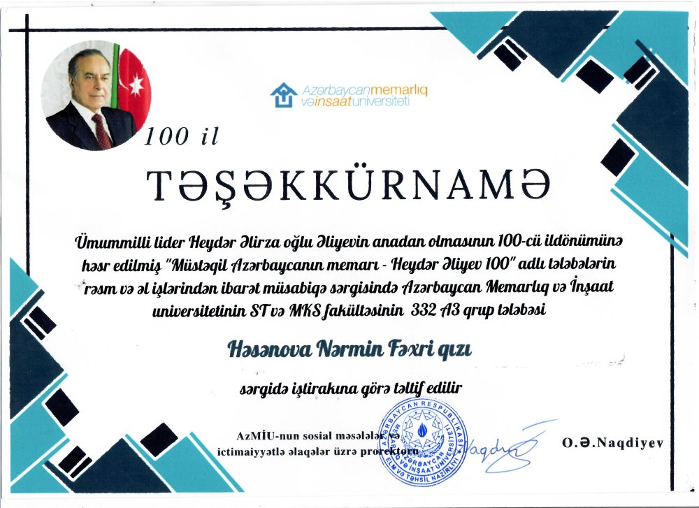 AzMİU-da Ümummilli Lider Heydər Əlirza oğlu Əliyevin anadan olmasının 100-cü ildönümünə həsr edilmiş “Müstəqil Azərbaycanın memarı – Heydər Əliyev 100” adlı tələbələrin rəsm və əl işlərindən ibarət müsabiqə sərgisində Azərbaycan Memarlıq və İnşaat Universitetinin “ST və MKS” fakültəsinin 332a3 qrup tələbəsi Həsənova Nərmin Fəxri qızı “Təşəkkürnamə” ilə təltif edilmişdir.